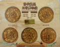 “清代龙凤五帝雕母钱”以黄铜精铸,仿雕母工艺呈现顺治、康熙、雍正、乾隆、嘉庆五帝年号钱。钱体金黄细密,钱文“镇库”与龙凤纹立体深峻,手工雕刻痕迹清晰,兼具古钱形制与装饰性。历史上,五帝钱承载“康乾盛世”的权威与吉祥寓意,“龙凤镇库”源于清代开炉大钱的祈福传统,龙纹威严、凤纹舒展,暗含“龙凤呈祥”“招财镇宅”的民俗信仰。虽为现代工艺复刻,却浓缩了清代雕母“字口如斩、刀痕犹存”的铸币精髓,既是对古钱文化的致敬,也以华美龙凤与五帝年号传递着平安昌盛的美好祈愿。