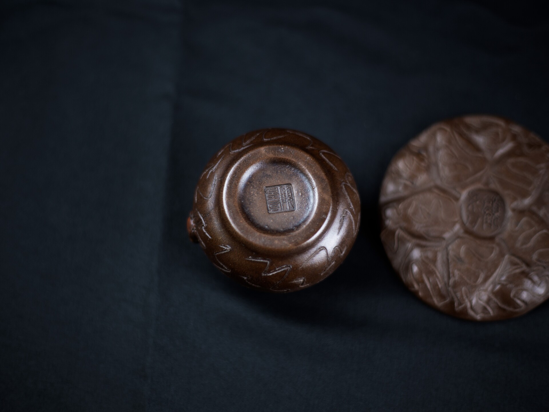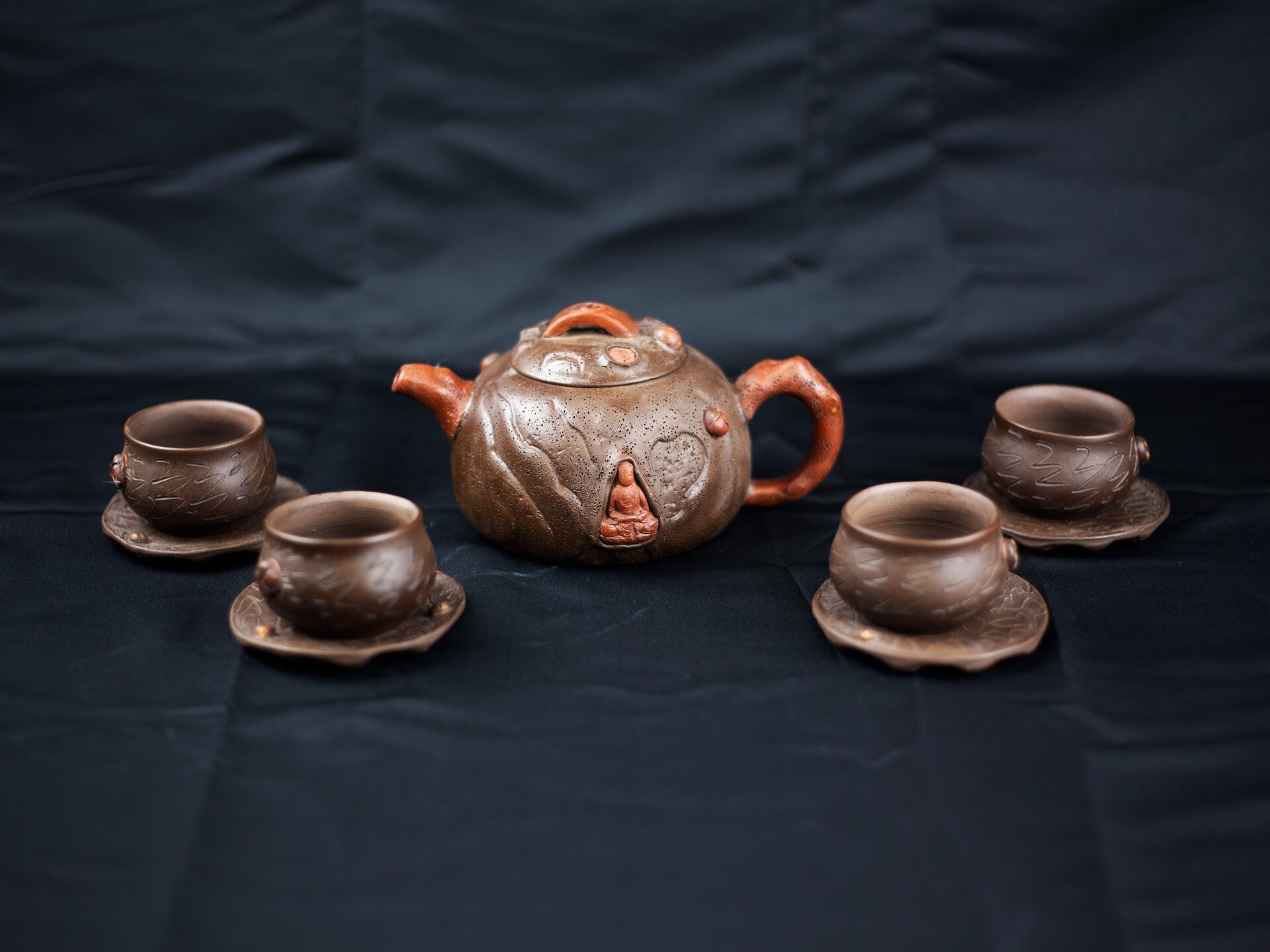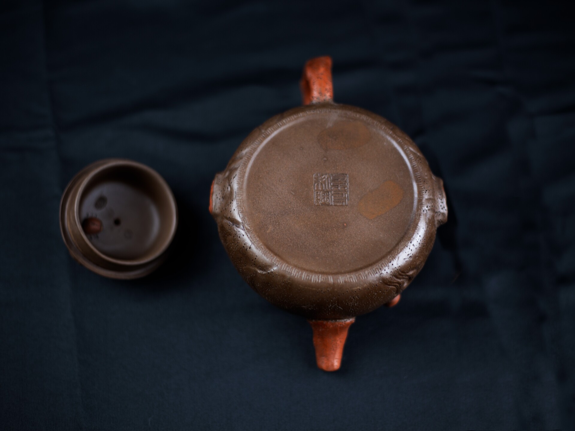 顾景舟此套仿生紫砂壶套组,尽显大师卓越匠心与紫砂艺术之美。它以古朴拙雅的造型、灵动精巧的细节和深邃内敛的禅意,构筑了一个茶、器、人、佛共融的微型宇宙。 顾景舟以紫砂为纸,以刀代笔,将树瘤、虫蚀等自然痕迹融入壶体,形成一种"似而非似"的意象美。壶身取法自然,却不着痕迹,既似千年古木的苍劲肌理,又如大地龟裂的天然纹路。甲虫的野趣、佛影的深邃、红砂的炽烈、黑底的虚空,在茶事中达成微妙平衡。 红砂制成的壶嘴与壶把壶钮,犹如古木上新生的枝芽,在沉稳的棕褐色基调中跳脱而出,既强化了视觉对比,又暗合"枯木逢春"的生命哲学。 顾景舟制壶工艺精湛,壶体线面挺括,部件衔接天衣无缝,尽显成型功力。泥料选用考究,色泽温润、砂质隐现,透气性佳,经泡养愈发莹润,契合紫砂“越养越活”特性,彰显泥料天然之美与大师驾驭能力。 |