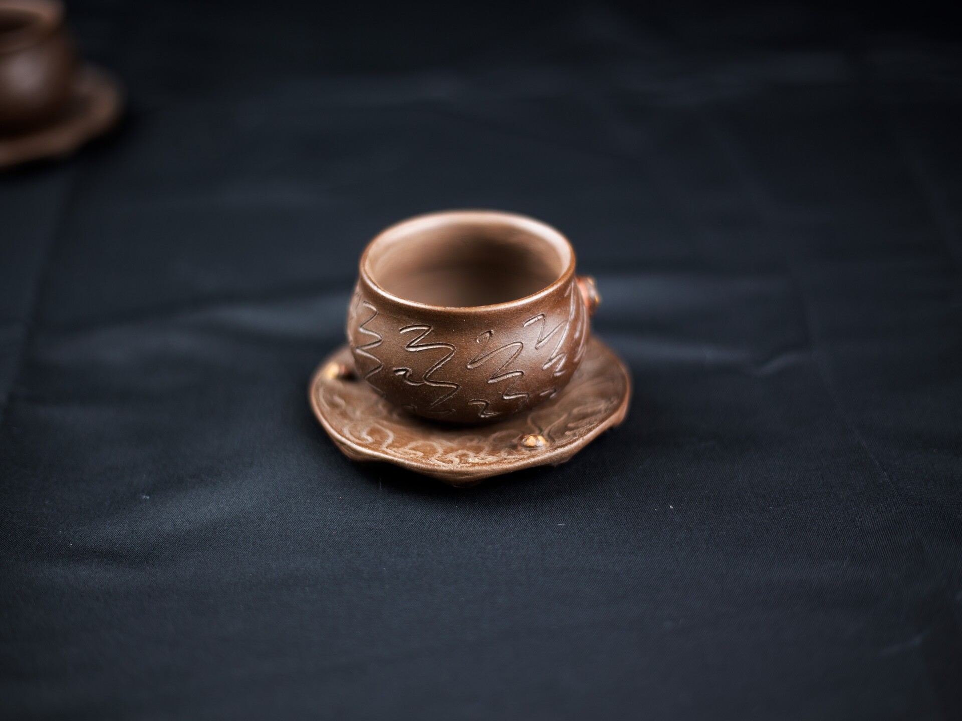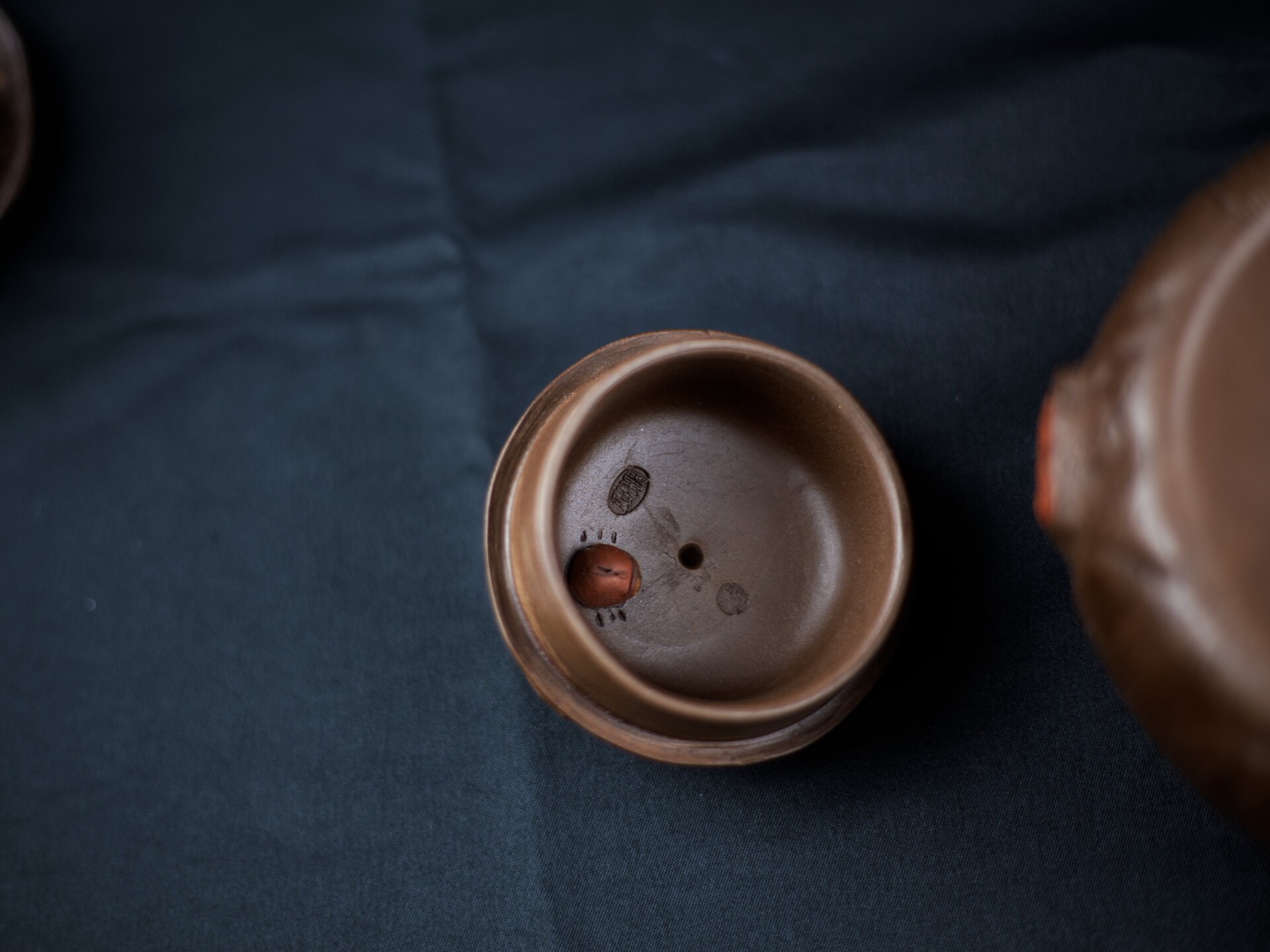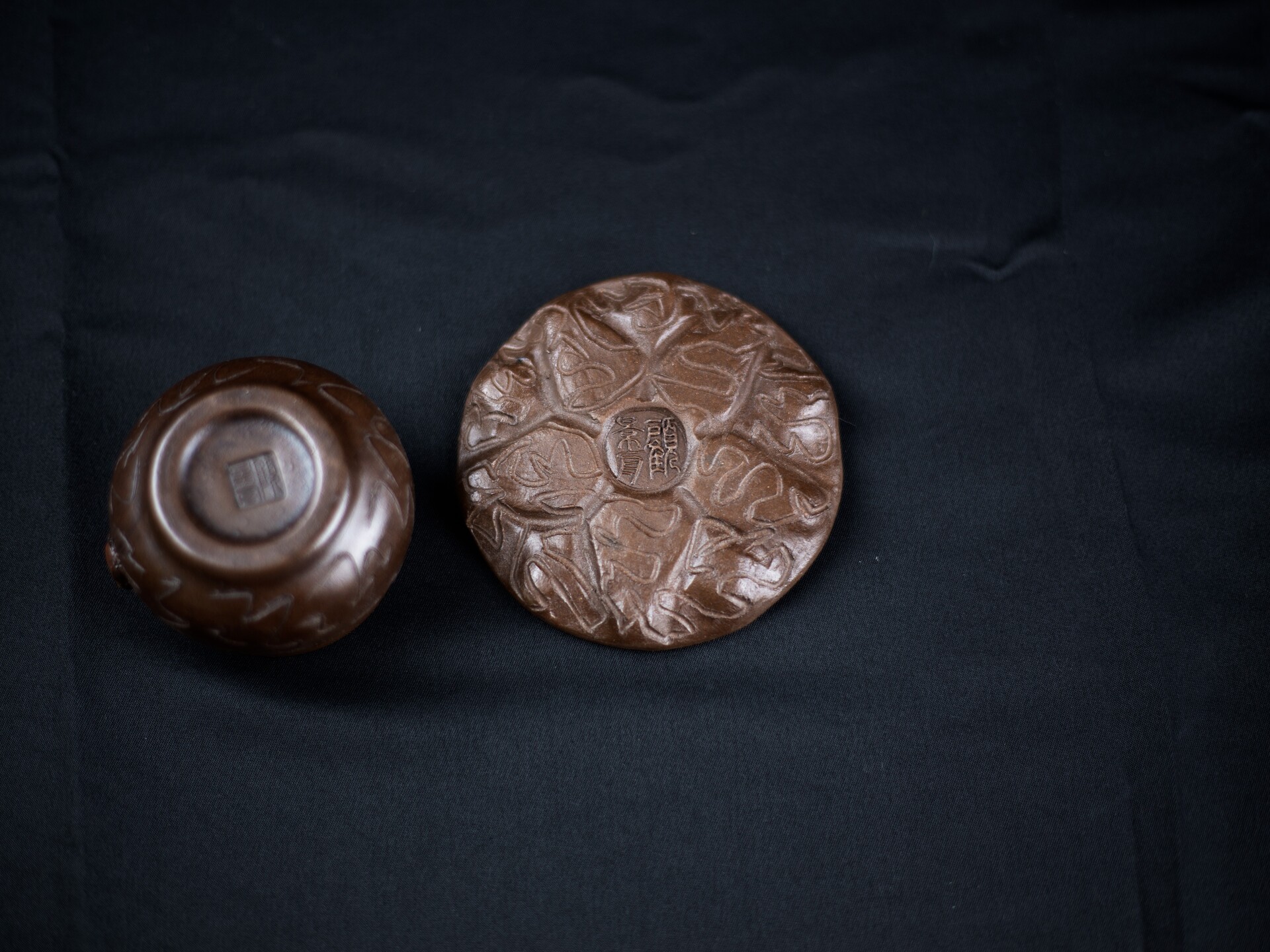 顾景舟此套仿生紫砂壶套组,尽显大师卓越匠心与紫砂艺术之美。它以古朴拙雅的造型、灵动精巧的细节和深邃内敛的禅意,构筑了一个茶、器、人、佛共融的微型宇宙。 顾景舟以紫砂为纸,以刀代笔,将树瘤、虫蚀等自然痕迹融入壶体,形成一种"似而非似"的意象美。壶身取法自然,却不着痕迹,既似千年古木的苍劲肌理,又如大地龟裂的天然纹路。甲虫的野趣、佛影的深邃、红砂的炽烈、黑底的虚空,在茶事中达成微妙平衡。 红砂制成的壶嘴与壶把壶钮,犹如古木上新生的枝芽,在沉稳的棕褐色基调中跳脱而出,既强化了视觉对比,又暗合"枯木逢春"的生命哲学。 顾景舟制壶工艺精湛,壶体线面挺括,部件衔接天衣无缝,尽显成型功力。泥料选用考究,色泽温润、砂质隐现,透气性佳,经泡养愈发莹润,契合紫砂“越养越活”特性,彰显泥料天然之美与大师驾驭能力。 |