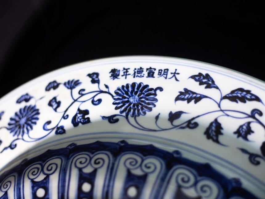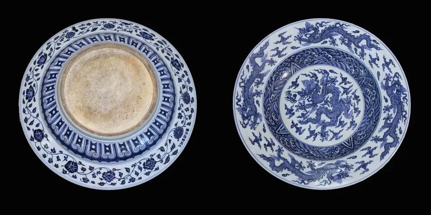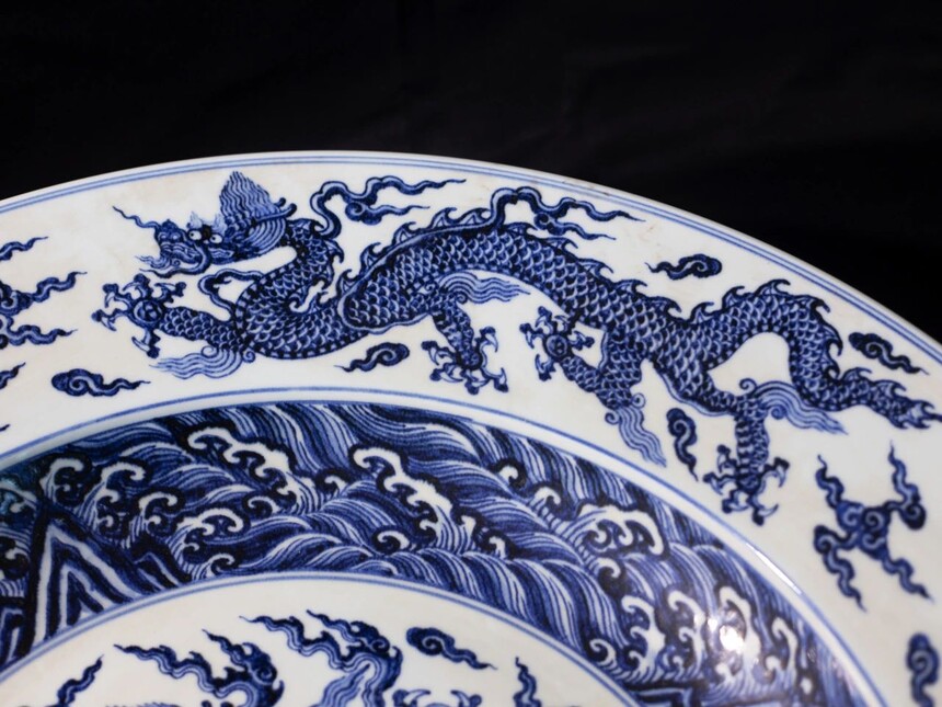 此大盘口径达58cm,体量巨大,气势恢宏。其造型规整,线条流畅,盘壁微微向外撇,如此大尺寸的盘子,在制作工艺上难度极高,需要高超的制瓷技艺才能保证其成型的规整与烧制过程中不出现变形、开裂等问题,这也从侧面反映出明代宣德时期景德镇御窑厂制瓷工艺的登峰造极。 宣德青花海水龙纹大盘的纹饰堪称一绝。青花发色浓艳青翠,深入胎骨,呈现出一种自然的铁锈斑,这是由于当时使用的进口“苏麻离青”料所致。这种青料在高温烧制下,与胎体和釉面完美融合,形成了独特的艺术效果。