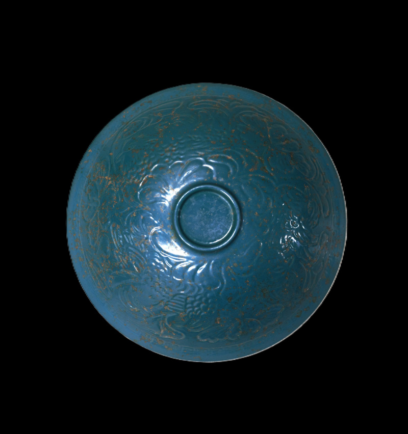 宋 定窑绿釉 刻花描金婴戏纹碗