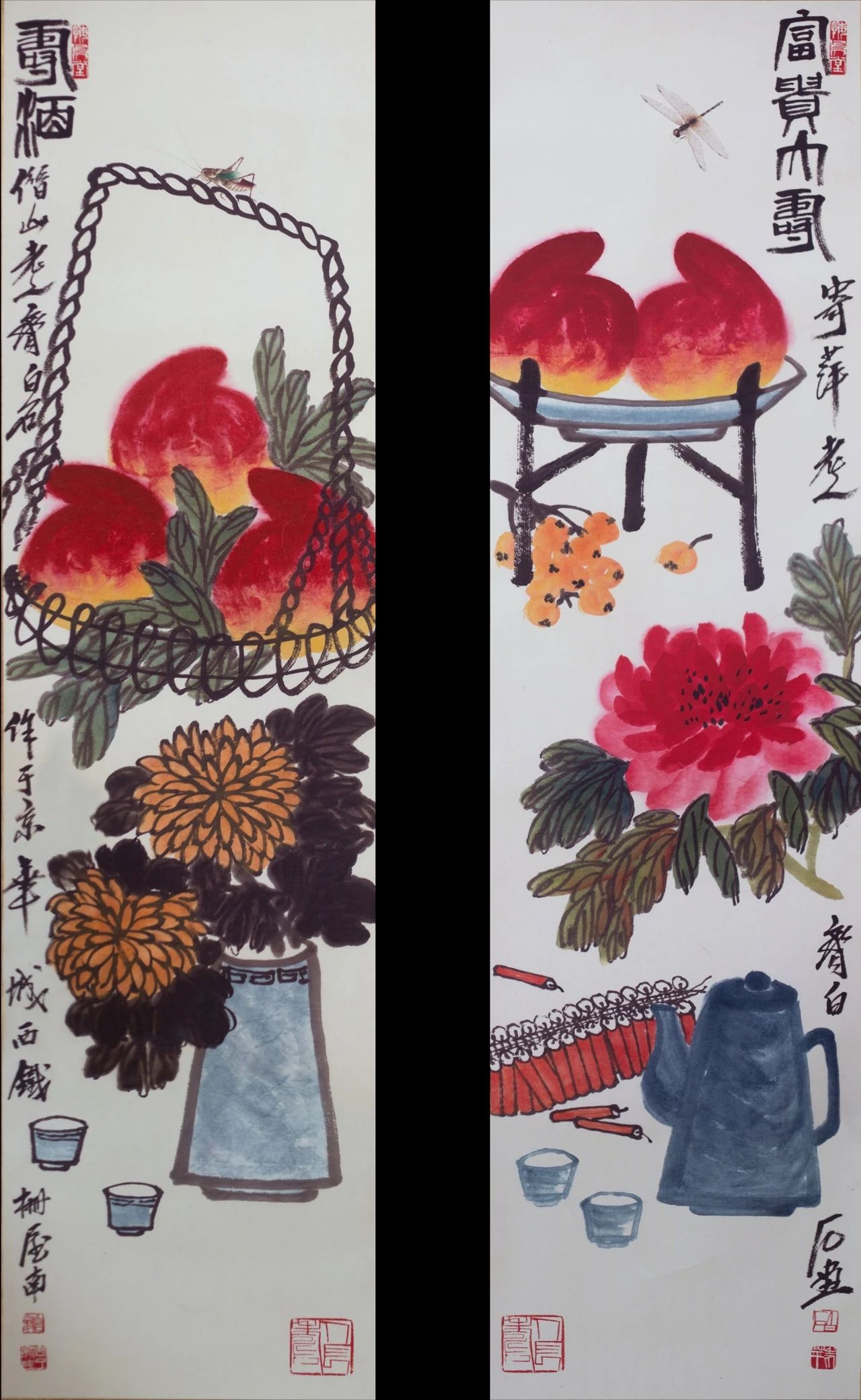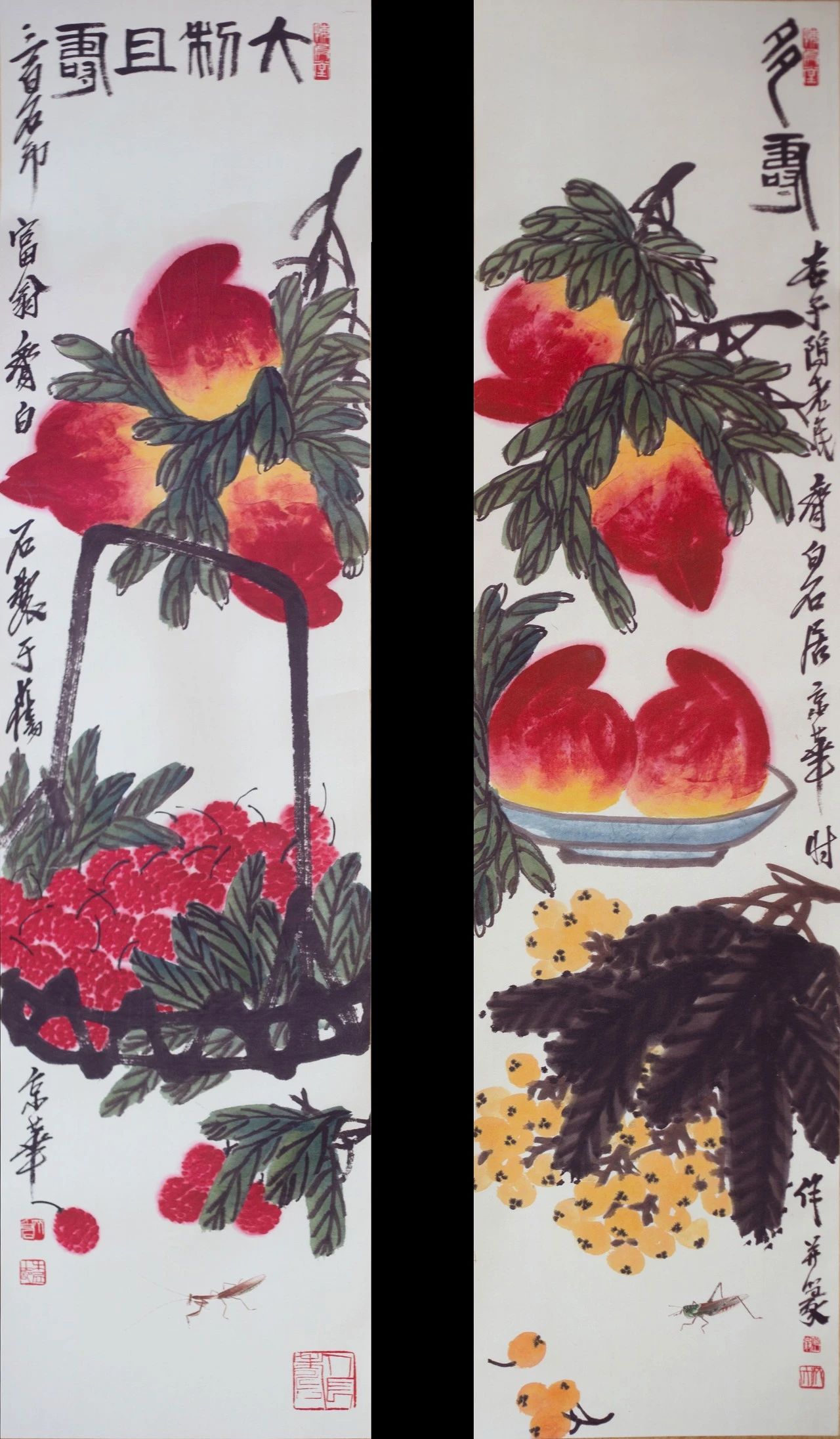 作者简介 齐白石(1863—1957年),名璜,字萍生,号白石、白石翁、老白,又号寄萍、老萍、借山翁、齐大、木居士、三百石印富翁等。湖南湘潭人,寄居北京,幼喜书画。15岁(1878年)时学木工,善雕花,人称“芝木匠”。25岁(1888年)开始学书画,习诗文,刻图章,兼作画工,为人画衣冠像。40岁(1903年)后5次游历南北各地,随地写景,成《借山图卷》52幅。60岁(1923年)后定居北京,以篆刻卖画为生。曾任北京艺专教授,受同时期书画家陈师曾影响,一弃旧习,从以徐渭、八大、石涛为宗的写意花鸟,转而取法吴昌硕创立的“红花绿叶派”,即大写意、设色浓艳高古的花鸟画。亦工水墨虾、蟹、鱼、蛙等水族,淋漓生动,饶有野趣。工笔草虫与写意花卉相配,工写结合,大气中见精醇。山水构图独出机枢,不循常规,聊写大意。刻印则尤能独出手眼,气度恢宏,蔚然成家。中华人民共和国成立后任美术家协会主席、人大代表,1956年获世界和平理事会和平奖。 妙笔生春 意趣天成 齐白石先生的写意花鸟画,以其奔放的生命力、浓郁的生活气息和独树一帜的艺术语言,成为了中国近现代绘画史上的璀璨明珠。这套《寿桃虫草四条屏》立轴,正是其艺术精粹的集中体现,将祥瑞题材、自然生趣、笔墨神韵与文人雅致完美融合,构成了一曲对丰饶生活与美好祈愿的视觉颂歌。 四条屏犹如四季流转中的生机画卷,巧妙地聚合了华夏文明中寓意最浓的祥瑞花果: 寿桃: 饱满欲滴,色泽红润如胭脂晕染,象征长寿安康、福寿绵长,是为画眼。那浑圆的造型和明艳的色泽,仿佛能闻其甜香,是白石老人对生命力最直白、最热烈的讴歌。