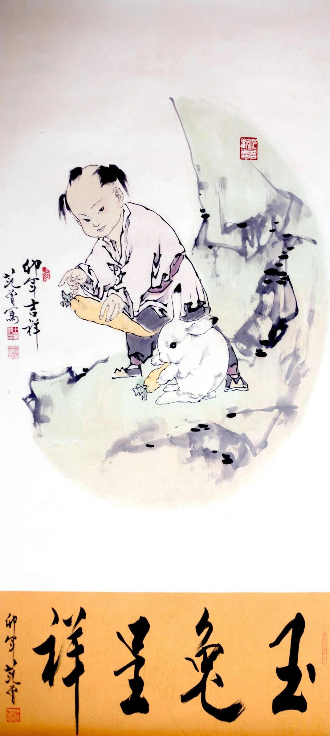 作者:范曾 尺寸:116×49cm 形制:立轴 《玉兔呈祥》紧扣传统吉祥文化主题。在中国传统文化中,玉兔一直是祥瑞的象征,常与月亮、长寿、祥瑞等美好寓意相连。画中童子手持胡萝卜,兔子专注进食,构建出一幅和谐、温馨且充满生机的画面。童子象征着天真无邪与希望,兔子代表着祥瑞与福气,二者的组合不仅传达出对美好生活的向往与祝福,更蕴含着对新岁吉祥、家庭和睦、幸福安康的祈愿。 在笔墨技法上,范曾先生充分展现了其深厚的传统功底与独特的个人风格。画中人物线条流畅简洁,以寥寥几笔勾勒出童子的轮廓与神态,线条粗细变化得当,刚柔相济,既有吴带当风的飘逸之感,又能精准地表现出童子的形体结构,体现出画家对人物画线条运用的高超技艺。兔子的描绘同样精妙,用墨细腻,通过墨色的深浅变化表现出兔子毛发的质感和立体感,使兔子形象栩栩如生。背景的淡墨渲染,看似随意,实则经过精心构思,通过墨色的浓淡干湿变化,营造出独特的意境氛围,体现了中国画“计白当黑”的美学原则。 |