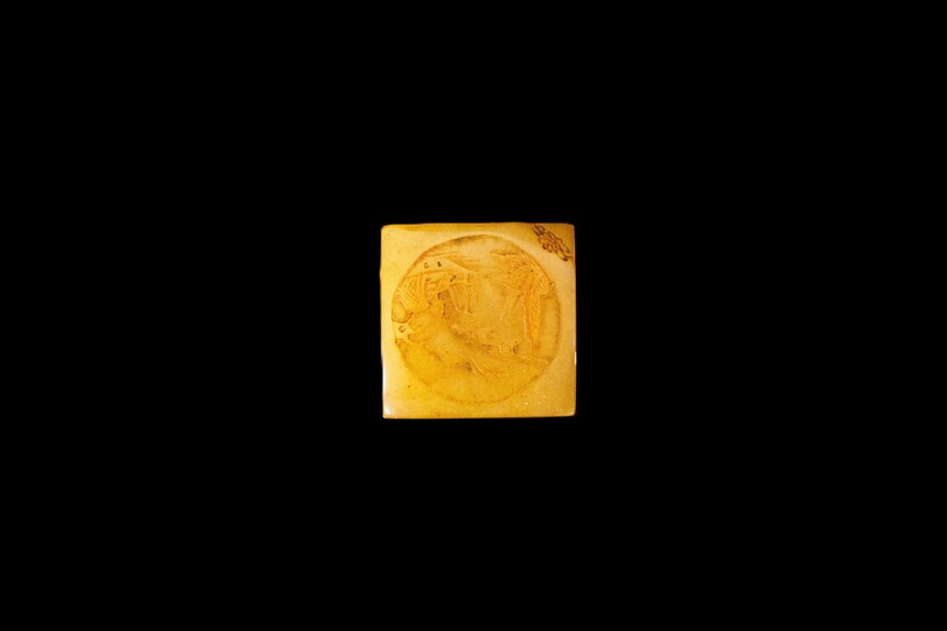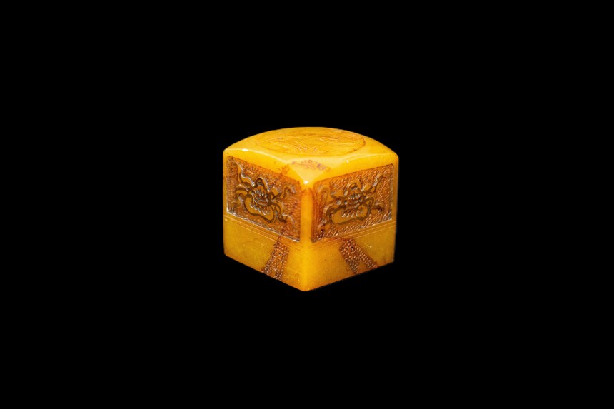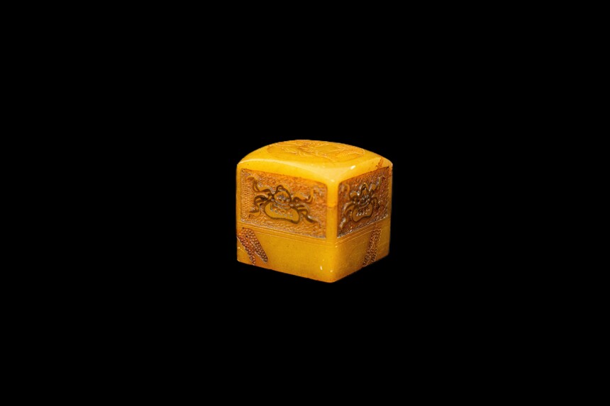 该方章采用珍珠地浅浮雕工艺,将工匠的高超技艺展现得淋漓尽致。以福禄纹饰为例,蝙蝠造型栩栩如生,线条流畅婉转,羽翼舒展间仿佛下一秒便要振翅高飞。刀法犀利而精准,工匠以刀为笔,在田黄石上精心勾勒每一处细节,无论是蝙蝠的羽翼纹理,还是周边装饰的线条,都处理得细致入微 。 珍珠地的巧妙运用,如同夜空中闪烁的繁星,与浅浮雕纹饰相互映衬,极大地增强了图案的层次感与立体感,使整个画面跃然石上,充满了灵动的艺术气息。这种精湛的雕刻工艺,不仅体现了工匠对传统技艺的深刻理解与娴熟掌握,更饱含着他们对艺术的执着追求和对美的独特诠释。
