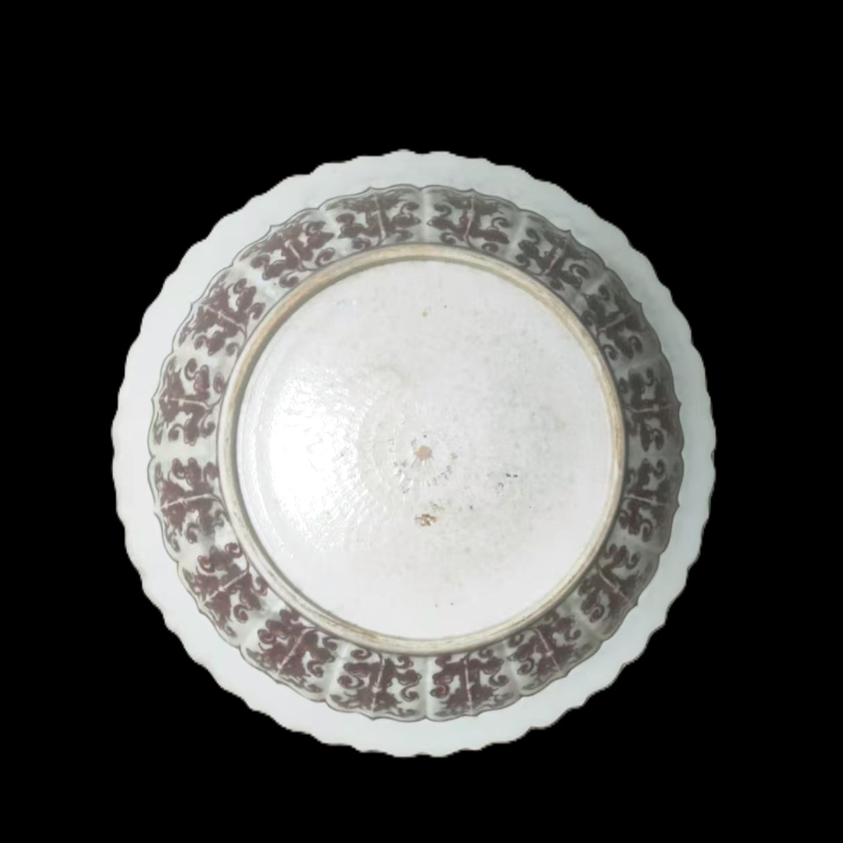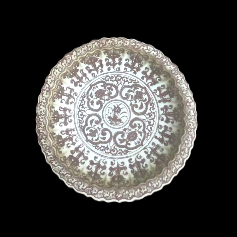 珍稀品类,传世罕见:釉里红自元代创烧,明代工艺更趋成熟却仍属官窑重器,存世量稀少。本品器型规整,花口设计别致,兼具实用性与艺术性,是明代釉里红瓷中的难得佳例。 釉色莹润,红韵典雅:盘身釉面洁白莹润,如凝脂般细腻;釉里红发色浓艳明快,色泽纯正均匀,无晕散之弊。红彩与白釉相互映衬,尽显明代官窑瓷器的雍容气度。
