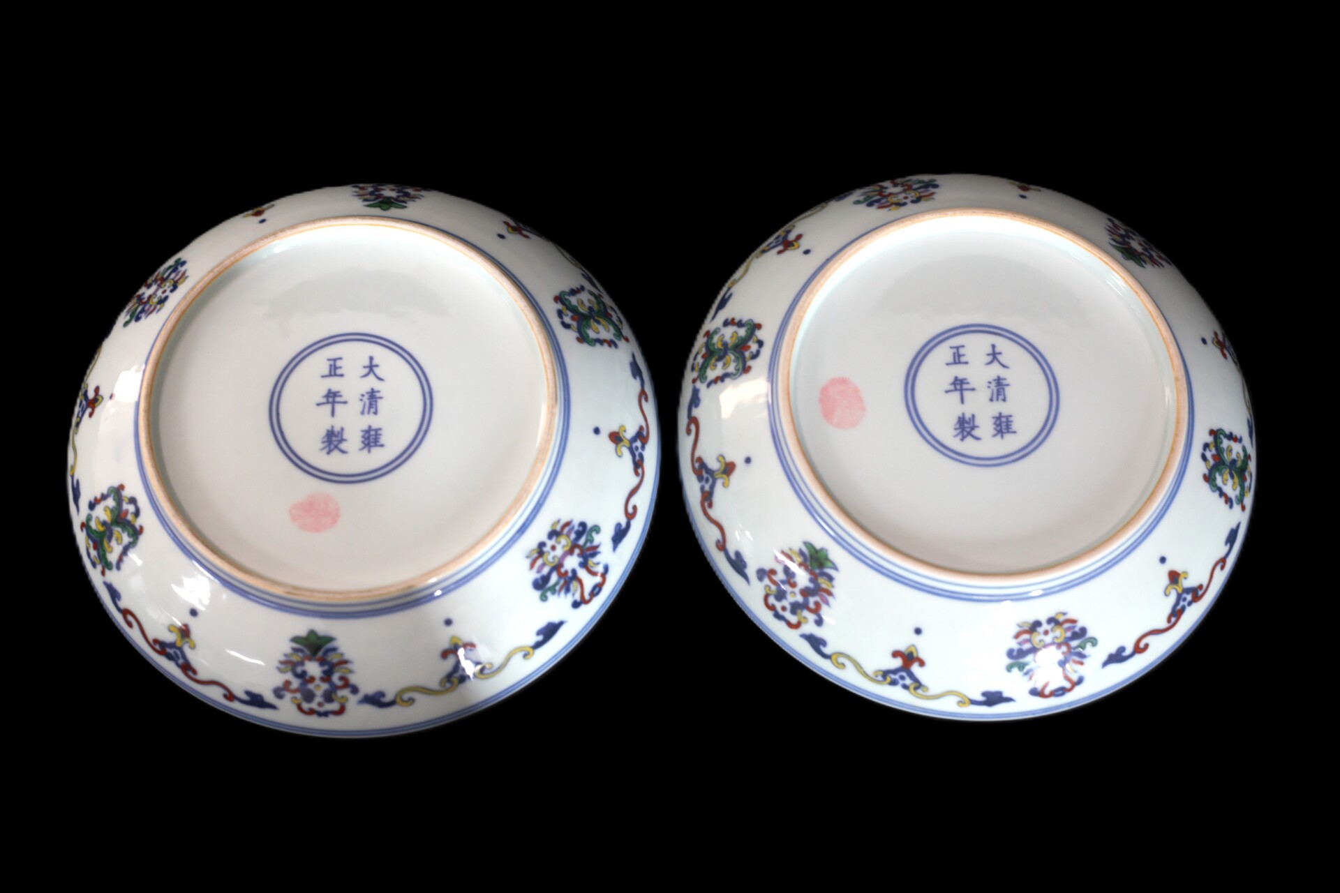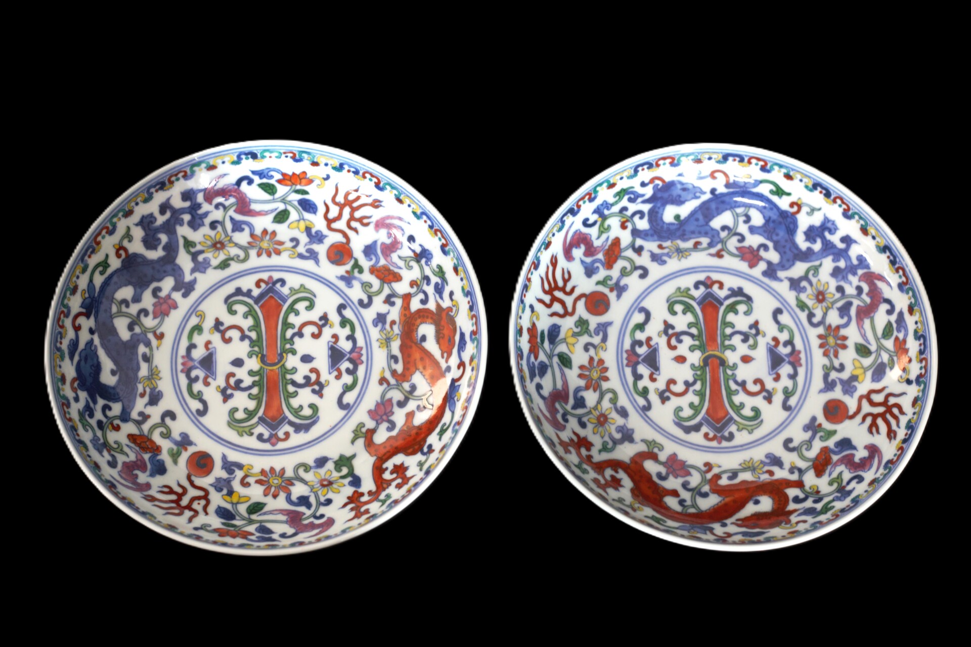这对雍正斗彩双龙纹盘口径19.8cm,造型规整,盘壁弧度优美,线条流畅自然,胎质细腻轻薄,尽显御窑厂制瓷工艺之精妙。 盘的青花发色沉稳,幽靓淡雅,勾勒出的线条细腻流畅,精准地描绘出卷草、双龙等纹饰的轮廓。盘心的卷草纹造型婉转流畅,线条富有韵律感,充满生机与活力。卷草纹在中国传统纹饰中象征着吉祥如意、富贵延绵。