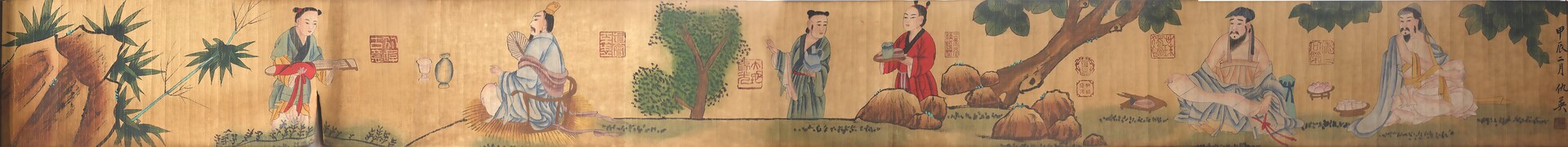 仇英的高士人物画长卷,以细腻笔触与雅致色调,将文人雅士的精神世界与生活意趣凝于绢素之上,既是明代院体画精工细作的典范,更是对传统“雅集”文化的生动注脚。画中吟诗作赋、抚琴品茗的场景,并非孤立的情节拼凑,而是以“雅”为脉络,串联起文人阶层的精神追求与生活美学,让观者得以穿越时空,窥见古代文人的理想生活图景。 |