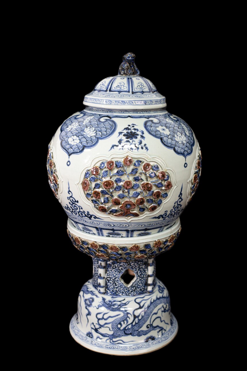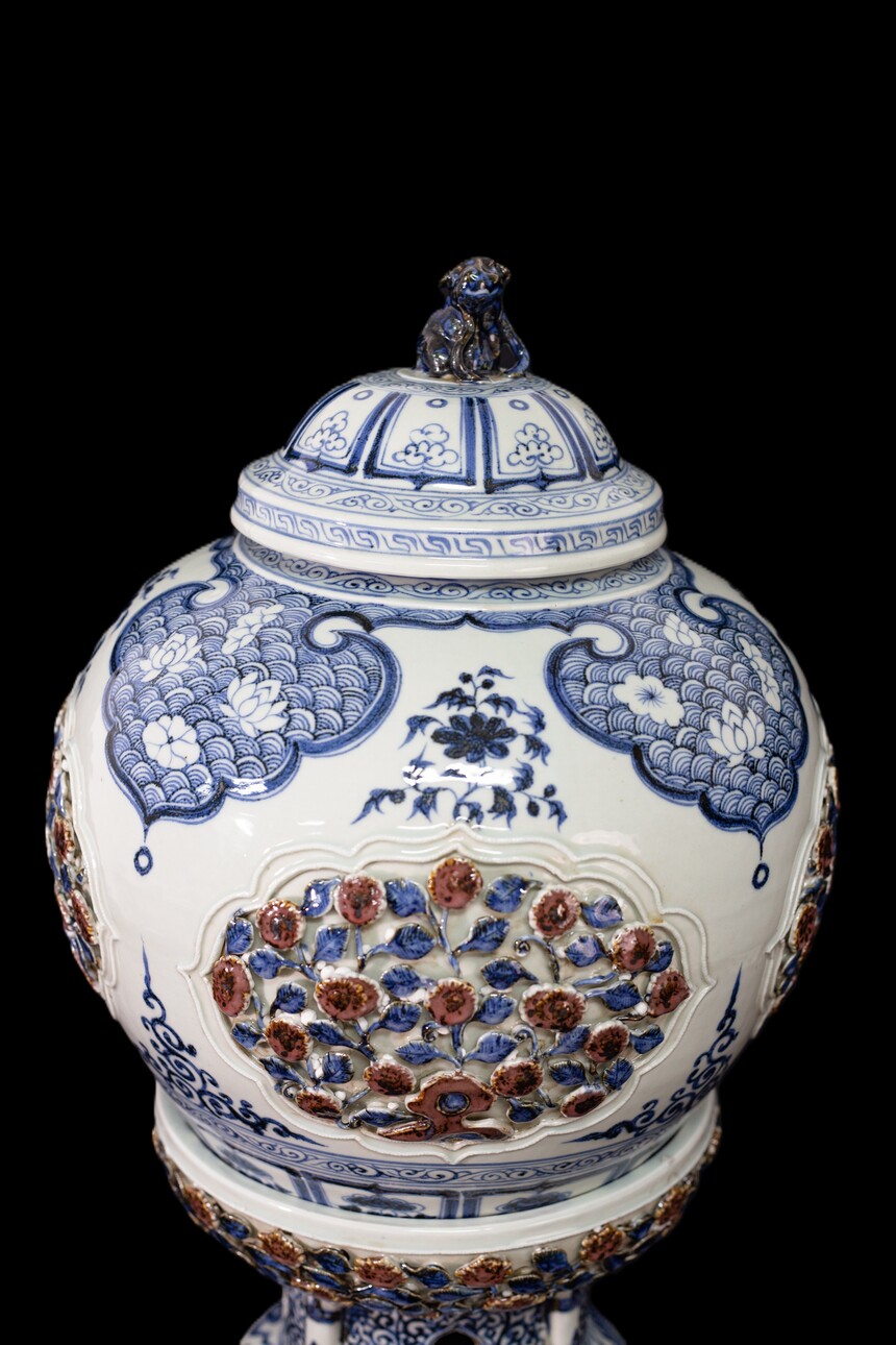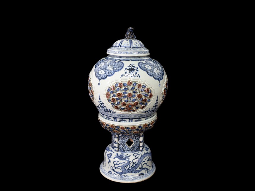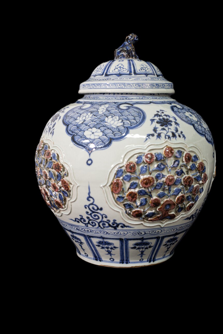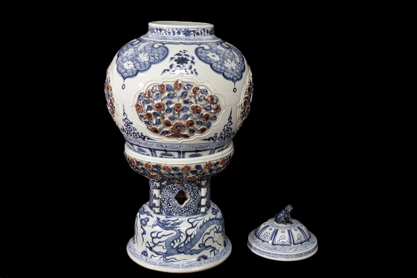 元代 青花釉里红捏塑开光 花卉纹兽钮盖罐