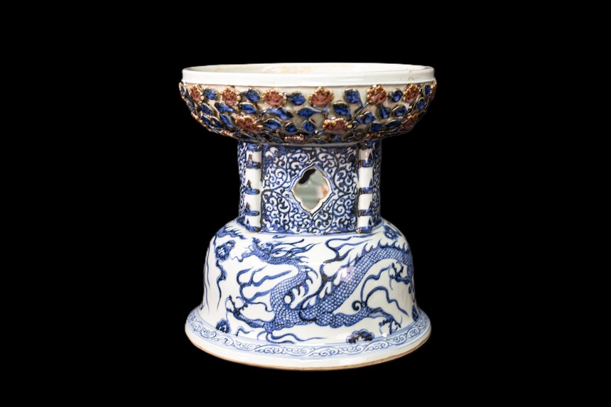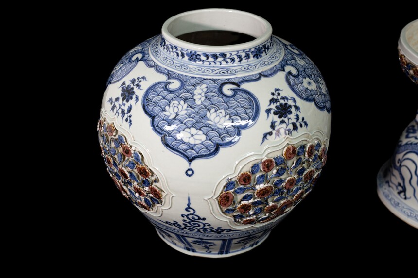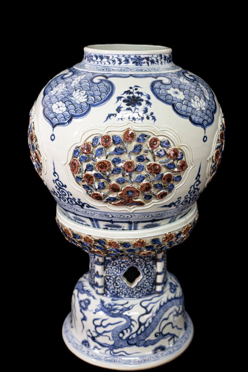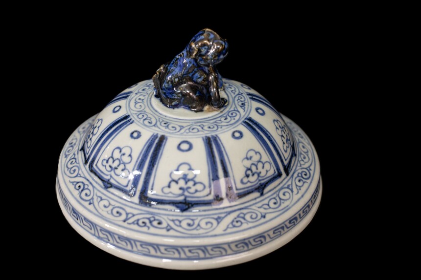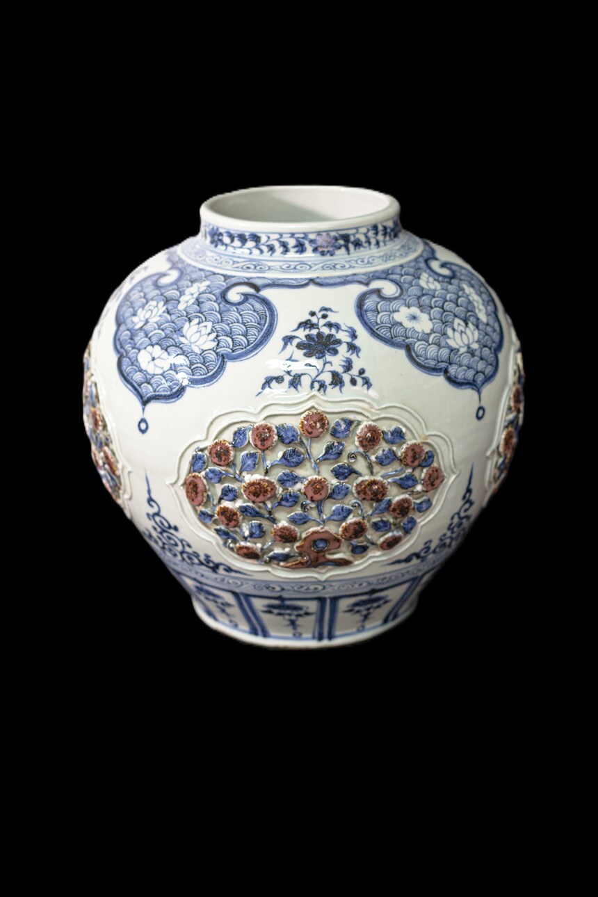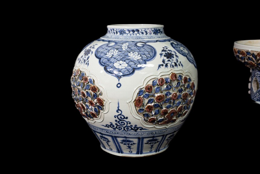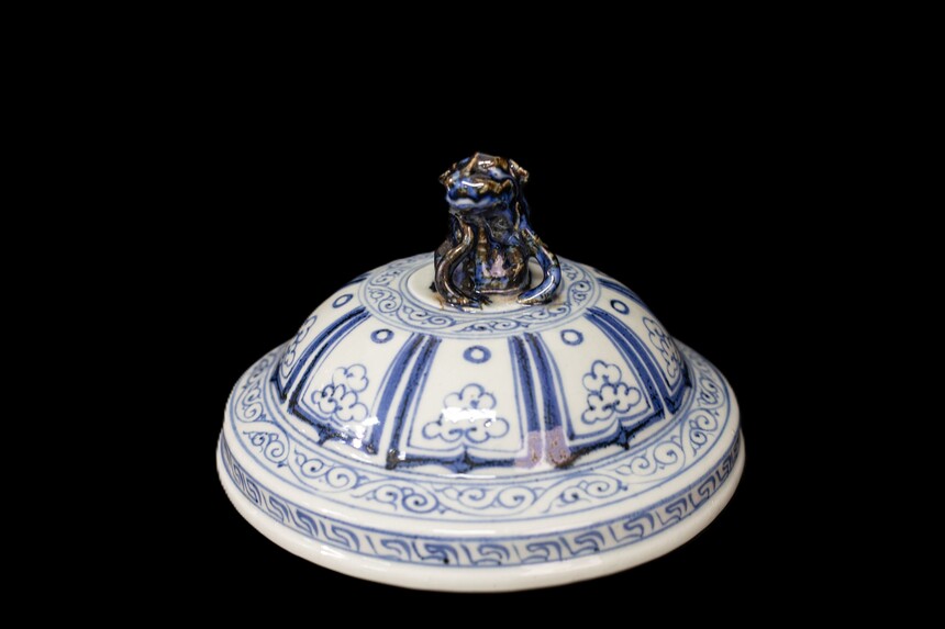 元代 青花釉里红捏塑开光 花卉纹兽钮盖罐