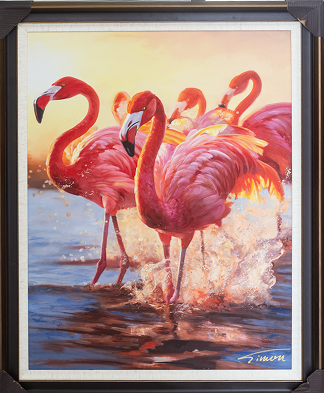 当他将目光投向火烈鸟,便有了这幅惊世佳作:炽烈红羽在画布上翻涌成浪,群鸟于水畔舒展、振翅,每一抹绯红都是热情的具象,每一次水花飞溅都是奔放的呐喊。他以精准的造型与富有动感的色彩,让火烈鸟的野性与优雅在画面中共生,将“热情奔放”的主题演绎得淋漓尽致——这不仅是对禽鸟灵韵的极致捕捉,更是对生命热烈本质的艺术礼赞。