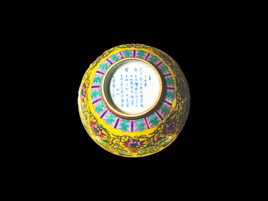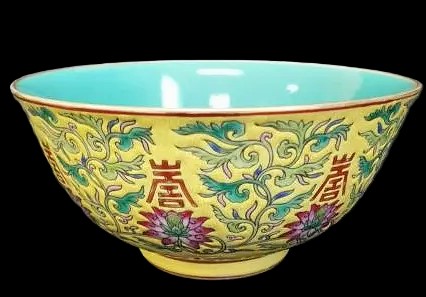 清 雍正 黄地粉彩 缠枝莲寿字纹御赐碗