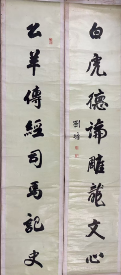 这是一幅承载清代帖学巅峰水准与文史哲思的书法巨制 ——刘墉《四兽名联》卷轴。联文 “白虎德谛雕龙文心,青羊传经司马记史”,以 “白虎”“青羊” 两只神兽为引,串联 “雕龙文心” 的文学奥义与 “司马记史” 的史学传承,将经史子集的底蕴凝于毫端。