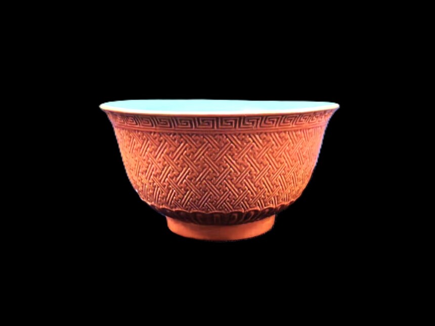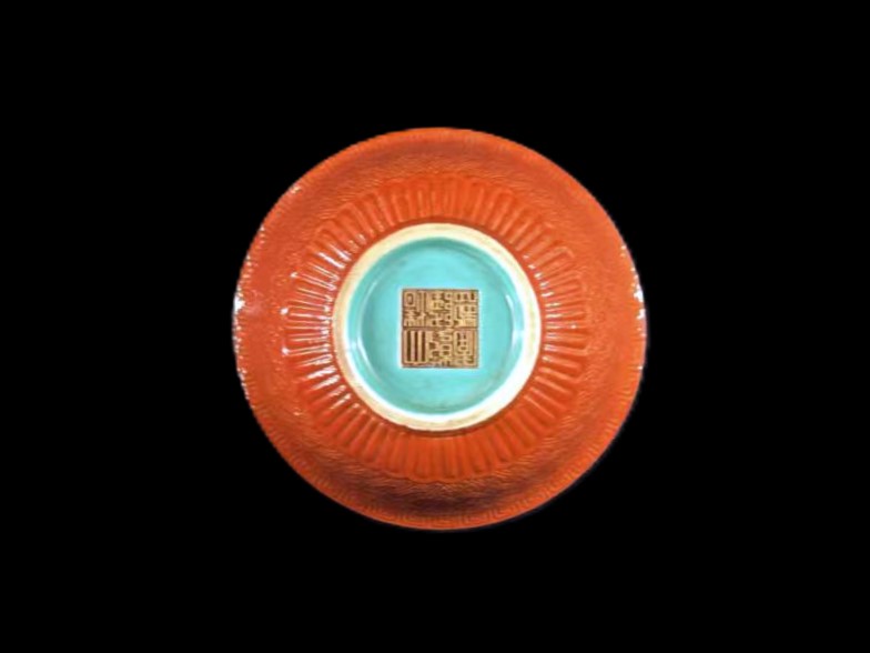 在清代乾隆朝的御窑传奇里,有一抹 “以瓷造漆” 的惊艳亮色 ——清乾隆仿雕漆釉描金万寿纹碗。 它是御窑工匠突破材质边界的智慧结晶,是宫廷艺术 “仿古开新” 的典范遗存,更是藏家可遇不可求的清代御瓷孤品。 乾隆帝对传统工艺的痴迷,催生出御窑厂 “仿生瓷” 的巅峰技艺。此碗外壁以红釉摹写雕漆神韵,经模印、雕刻、施釉等数十道工序,将漆器 “层层髹漆、刀刀雕琢” 的质感复刻得惟妙惟肖:锦纹的交错、回纹的流转、莲瓣纹的起伏,抚之若触漆器的温润肌理,观之却具瓷器的莹润光泽,堪称 “瓷中漆器,漆中瓷魂”。 内壁松石绿釉澄澈如碧潭,与外壁红釉形成强烈视觉碰撞;口沿金彩描边熠熠生辉,为华贵器型再添皇家气度。三色交融间,工艺的繁复与美学的精妙达到极致,尽显乾隆御窑 “不惜工本、追求极致” 的制瓷信仰。