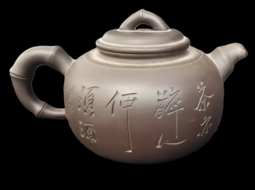 当紫砂的深沉质感邂逅竹的清逸风骨,当匠人匠心碰撞文人雅趣,便有了徐汉棠这款竹韵紫砂壶的传世传奇。紫砂界的“竹器大师”,以对竹之形、神、意的极致雕琢,在紫砂史上留下浓墨重彩的一笔。这款竹韵壶,精选宜兴黄龙山优质紫泥,经反复捶打、陈腐,泥质细腻温润,透气性与可塑性俱佳,为壶的质感与实用性奠定了根基。 观其形,壶身圆润饱满如君子怀璧,竹节状的壶把、壶嘴、壶钮一气呵成,将竹的挺拔灵秀凝于方寸之间。轻抚壶身,竹节的肌理与紫砂的砂感交错,仿佛能触摸到江南竹林的清风。更妙的是壶身刻绘的诗句,笔锋苍劲,墨韵流转,把文人品茶的雅致情怀刻进了紫泥深处,让壶不止是器,更是一首可把玩、可品味的立体诗。