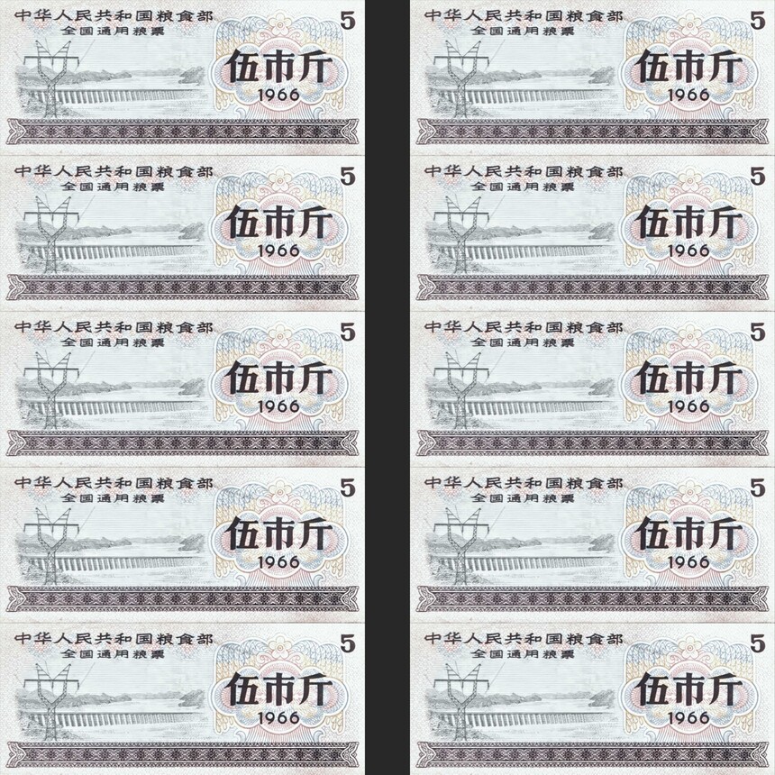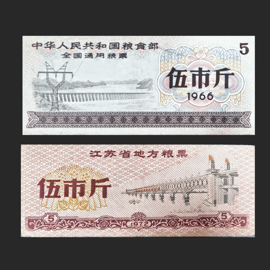 【一枚组票,两段经济记忆】 这组藏品包含1966 年中华人民共和国粮食部发行的全国通用粮票(伍市斤版)与1972 年江苏省粮食局发行的地方粮票(伍市斤版),是中国计划经济时期 “全国统筹 + 地方调剂” 粮食供应体系的鲜活实物见证。 1966 年全国通用粮票(伍市斤版)图案元素:主图为水利电力工程,展现了 20 世纪 60 年代国家对农业基础设施(灌溉、电力)的重视,传递 “以工促农、全国一盘棋” 的建设理念。版式风格:字体规整庄重,印有 “中华人民共和国粮食部”“全国通用粮票”“伍市斤”“1966” 等信息,兼具行政权威性与流通实用性。工艺细节:采用胶版印刷,部分版本带有 “五角星水印”(防伪设计),纸张坚韧,历经岁月仍能保留清晰细节。1972 年江苏省地方粮票(伍市斤版)图案元素:主图为南京长江大桥(江苏地标性建筑),既体现江苏省内重工业与交通建设的成就,也暗含 “地方经济自主发展” 的时代印记。版式风格:票面以红色为主色调,印有 “江苏省地方粮票”“伍市斤”“1972” 等字样,设计更具地方特色,图案细节(如大桥的桥塔、钢梁)刻画精细。工艺细节:采用多色胶印技术,底纹带有几何花纹防伪,纸张为地方票证专用纸,质感与全国粮票形成差异化特征。