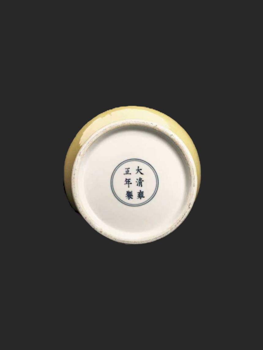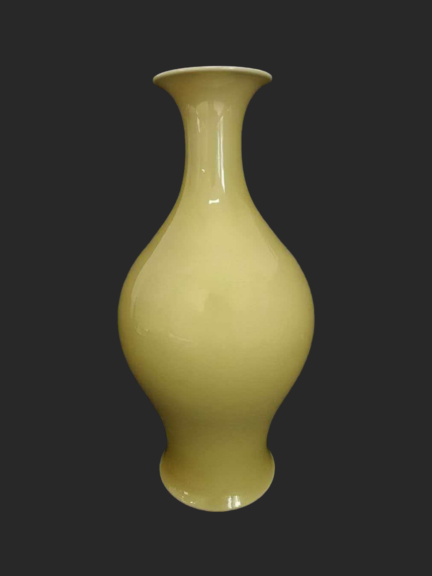 这件高39.5cm的柠檬黄釉橄榄瓶,以其精妙的形制、雅致的釉色与严苛的工艺,成为雍正帝“雅好古器,精于品鉴”的最佳注脚。 柠檬黄釉是雍正时期创烧的低温颜色釉珍品,其色泽如初夏柠檬的娇嫩鲜黄,清透淡雅却又不失华贵。在古代,黄色是皇家专属的“至尊之色”,而雍正朝的柠檬黄釉,摒弃了前代黄釉的浓重沉闷,以细腻的呈色工艺,将黄色的贵气凝练成一抹清新雅致的“御窑专属色谱”。
