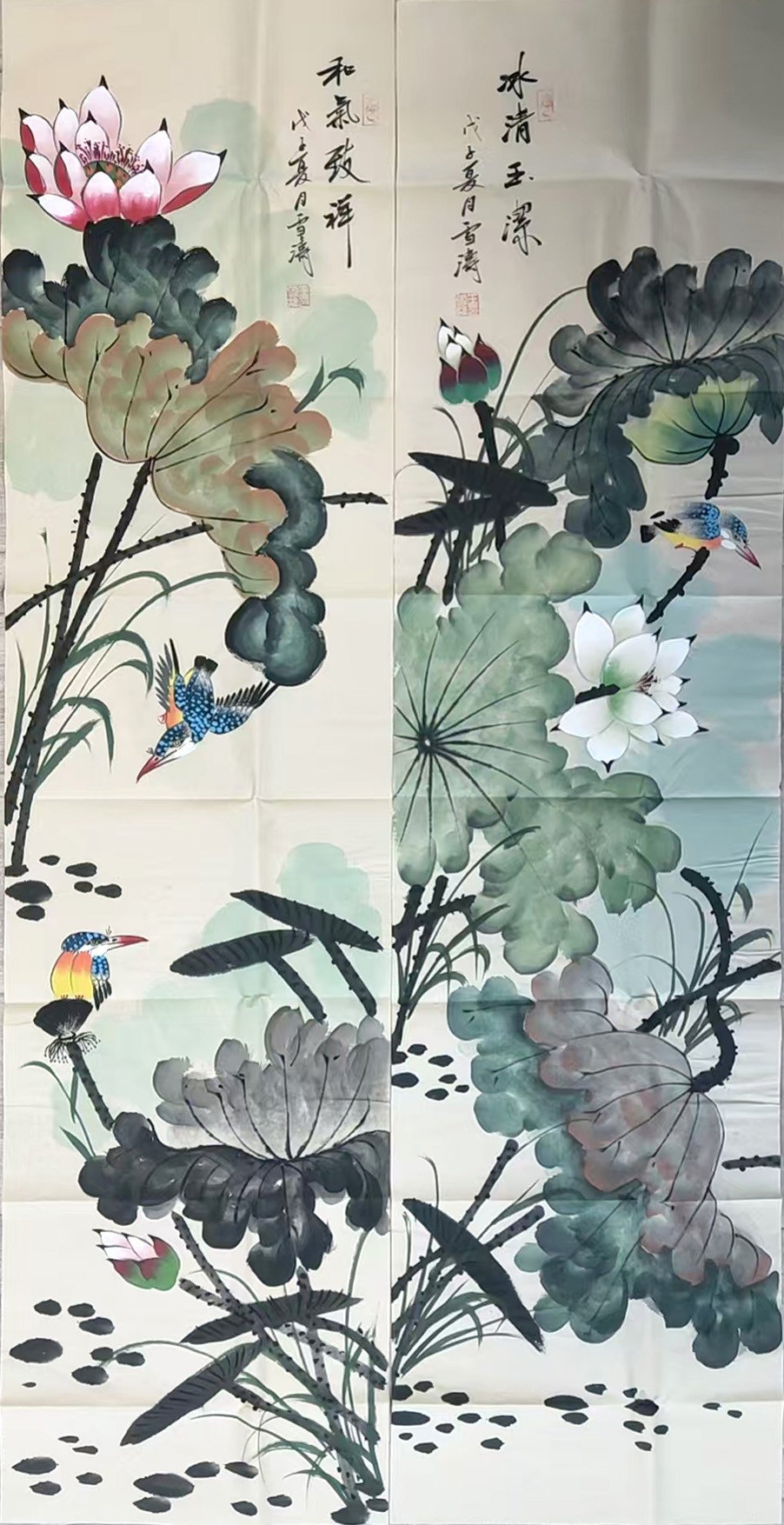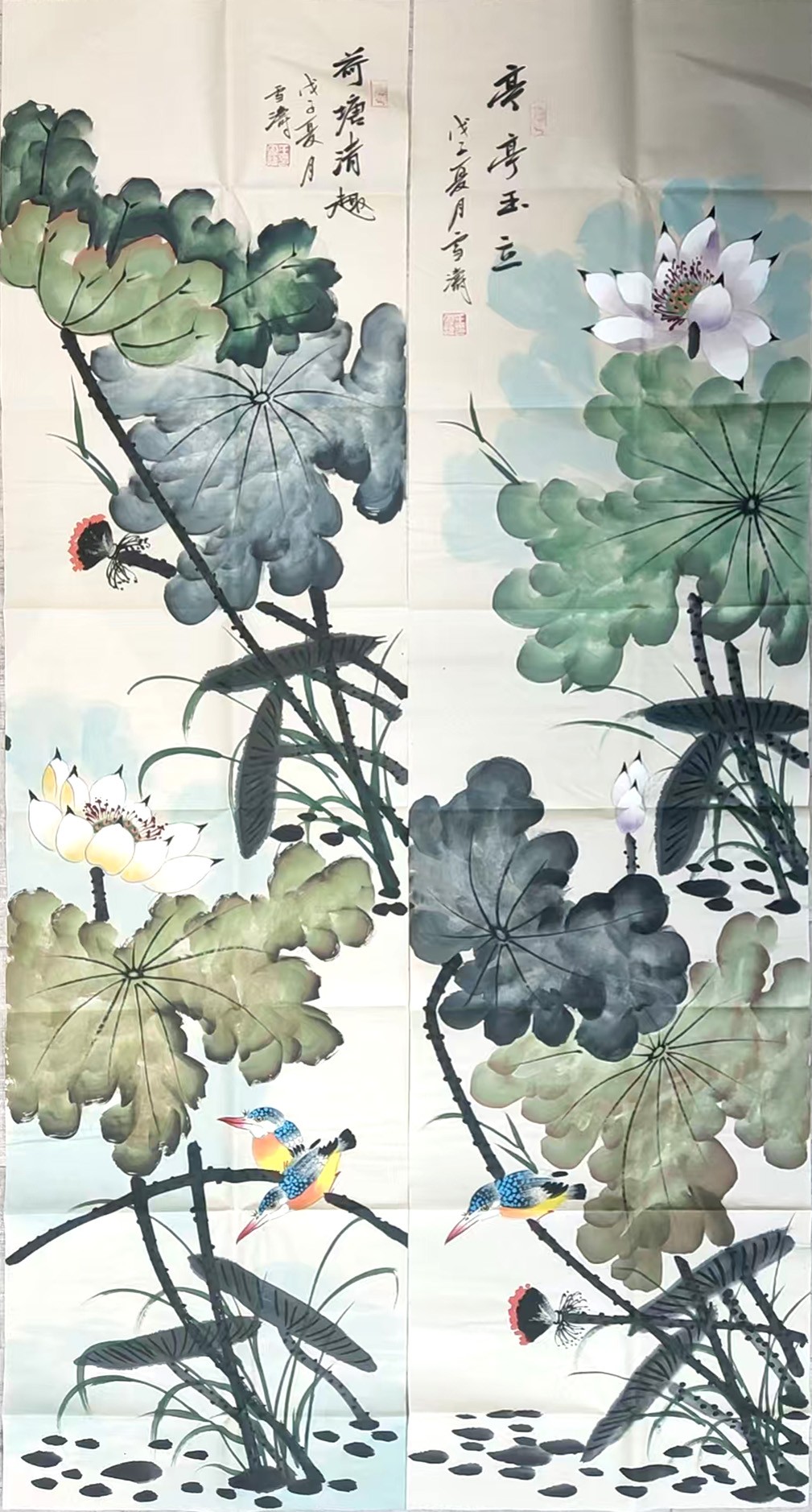 王雪涛作为 20 世纪京津画派的代表画家,以画花鸟著称,尤其擅长表现荷塘、禽鸟、草虫等题材。《荷塘清趣四屏》以四幅连屏的形式,分别描绘了荷塘不同时节、不同角度的景致:或荷叶田田、荷花绽放,或莲蓬饱满、水鸟栖息,笔墨间尽显夏日荷塘的清新生机。