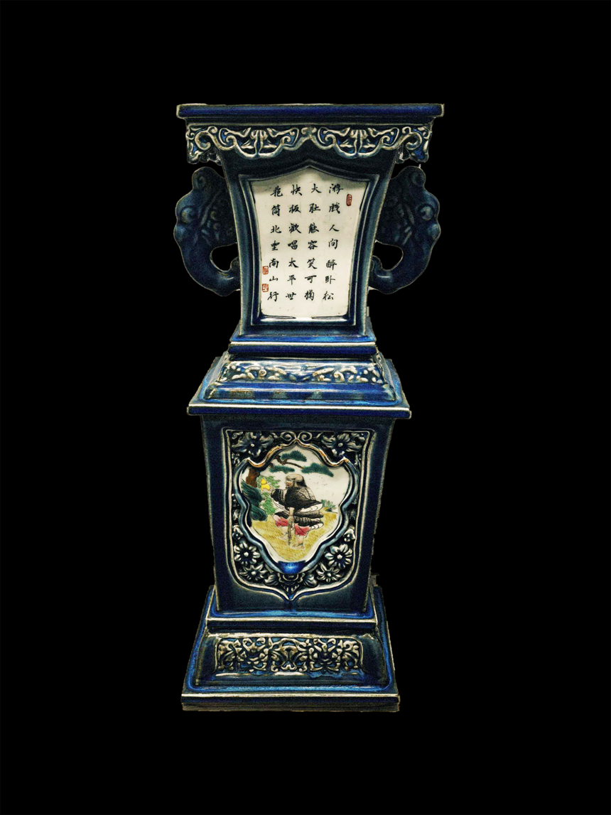 首页 >> 拍品展示 >>瓷器类 >> 清乾隆 霁蓝釉粉彩 镂空八仙四方象耳尊