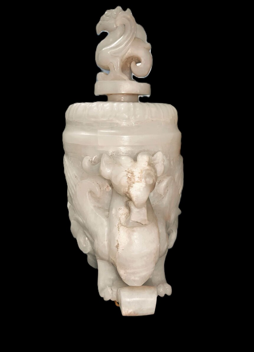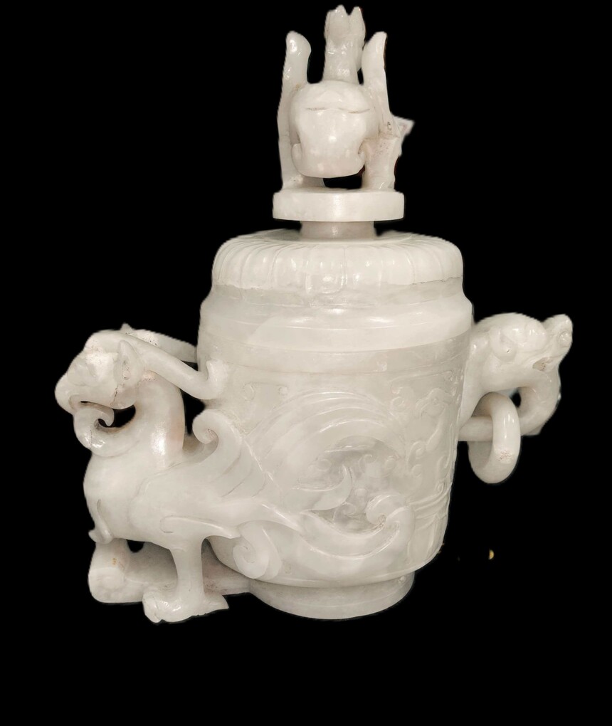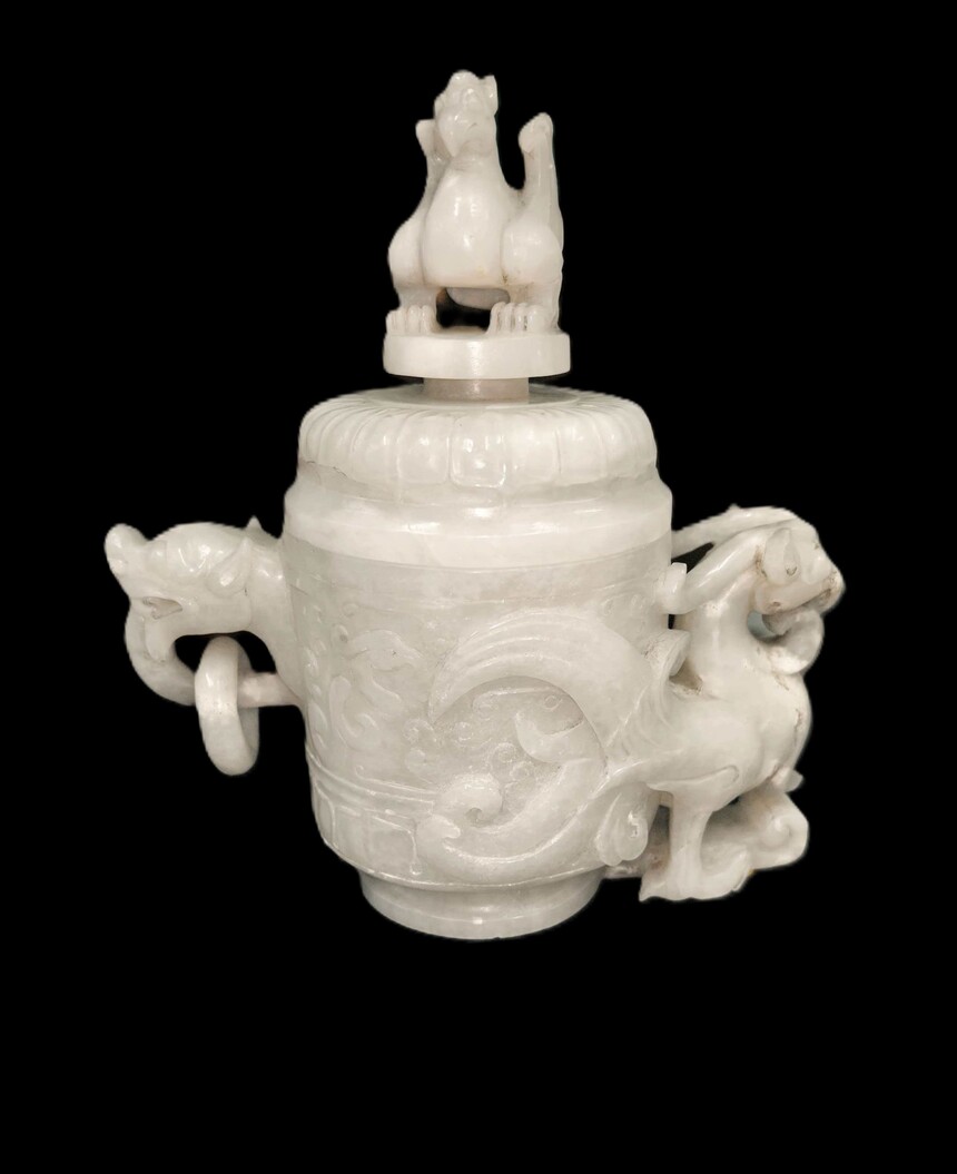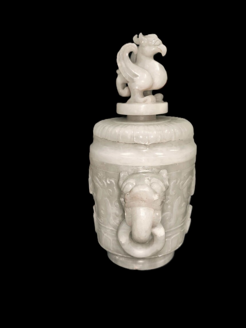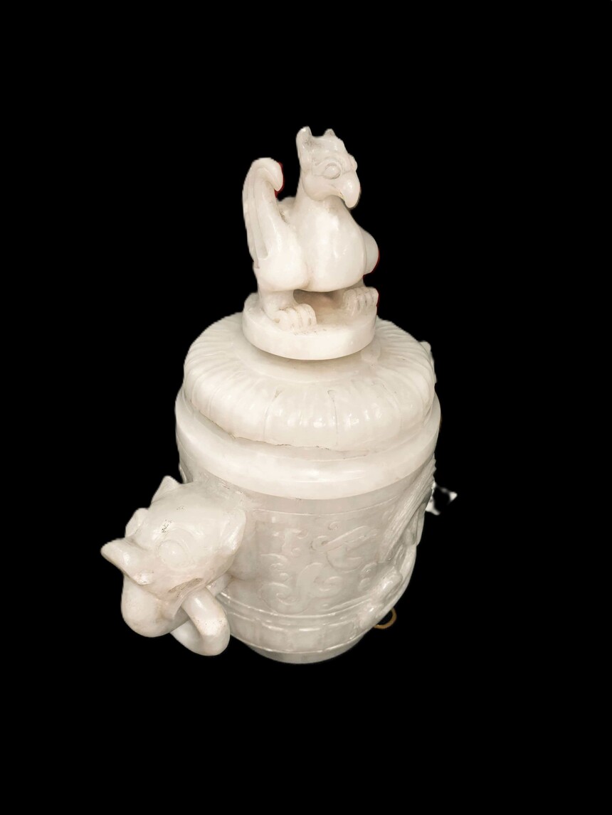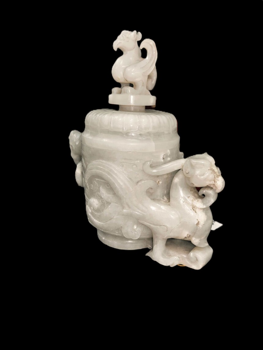 东汉朱雀凤鸟纹龙耳套活环饕餮纹和田白玉鼎
