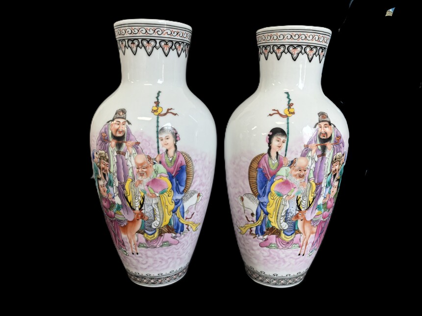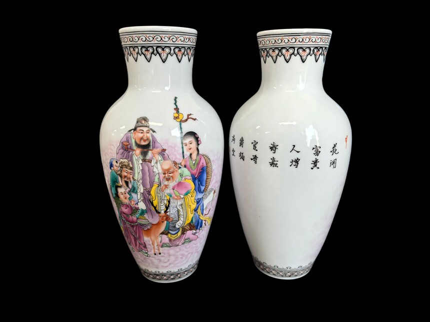 瓶身以粉彩满绘 “福禄寿三星” 人物故事图,衣纹色彩浓艳饱满,人物神态细腻传神:寿星持杖、禄星捧笏、福星含笑,搭配仙鹿、侍女等元素,画面层次丰富,寓意 “福禄寿喜、富贵满堂”。每一处细节都凝聚着御窑匠师的极致匠心,是乾隆粉彩 “工致细腻、繁丽华贵” 的典范。